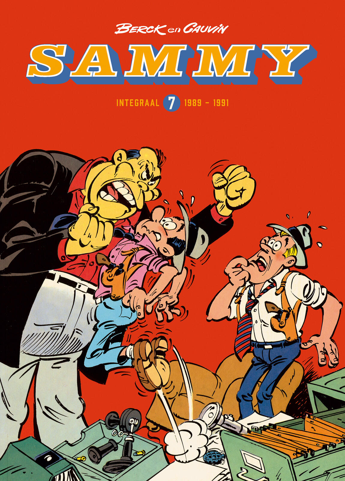 Vier komische avonturen met meer dan 70 bonuspagina’s! Ook te koop als luxe met ex libris. 'Berck en Raoul Cauvin plaatsen Sammy en Jack weer in uiteenlopende situaties. Ze krijgen een tegenstander van formaat voor de kiezen: een gele kolos waarvoor ze de onvrijwillige hulp van Al Capone inroepen. Het regent geruïneerde investeerders na de befaamde beurscrash van 1929. Hun nieuwe klant verliest ook al zijn centen. Het baasje van een bijtgraag hondje is gevaarlijker dan het mormel. En als ze betaald willen krijgen van een Kennedy-erfgenaam moeten ze hem eerst van zijn hardnekkige verslavingen afhelpen. Het achtergronddossier biedt een rijk geïllustreerd overzicht van Bercks andere reeksen Lombok, De Donderpadjes en Lowietje. In het hoofdstuk over Raoul Cauvin komt met Cédric een van zijn grootste successen aan bod. Saga Uitgaven bundelt alle verhalen van Sammy in een reeks van tien integralen met heel wat bonuspagina’s. Deze integraal bundelt in chronologische volgorde de avonturen De Mandarijn, Crash in Wall Street, Een Hondenbaantje en Sigaretten en Whisky.'