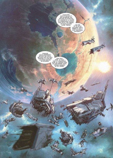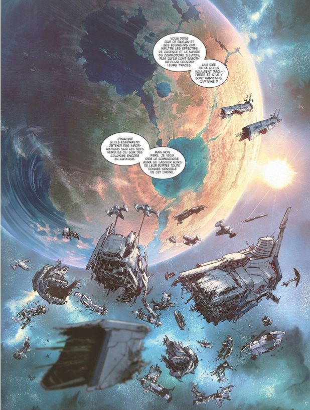 Score moyen 4 / 5Even een korte samenvatting voor wie de reeks ‘Kolonisatie’ onbekend is. De reeks verhaalt over de mensen die kolonisaties opstarten op andere planeten. Dit doen ze aan de hand van portalen, die ze verkregen hebben van de Atils, een buitenaards volk die veel verder staat dan de mensheid. Bij het koloniseren van de planeten loopt er echter vanalles verkeerd waardoor Milla en haar team ingeschakeld worden om de kolonisten te helpen of te redden in geval van nood. Daarbij komen ze ook in contact met piraten die de kolonisatieschepen willen plunderen. In het vorige deel waren we getuige van Raylan, een piraat die onafhankelijk optreedt, die het agentschap saboteerde die de verloren arken opspoort. De reden hierachter wordt duidelijk in dit deel. Intussen zijn we beland in het 6de verhaal van deze succesvolle reeks. In ‘Schaduweenheid’ worden de teams opgesplitst, waardoor er 2 verhaallijnen te volgen zijn. Enerzijds volgen we de groep met de Atil die binnendringen op een piratenschip en daar verontrustende zaken ontdekken, waarbij ze aangevallen worden door dezelfde monsters als in het vorige deel. Anderzijds stappen we in de sporen van Milla die een geheime basis infiltreert die gecompromitteerd is door piraten. Zij weten daar een laborante te redden die ontdekt heeft dat de Atils de mensen bedriegen door in hun levensreddende vaccin een middel toe te voegen die de mensen overal kan traceren. Weten Milla en haar team zich opnieuw te redden uit de moeilijke situaties? En welke rol speelt Raylan in dit verhaal ? Opnieuw worden we in dit deel verwend met prachtige plaatjes. Tekenaar Vincenzo Cucca (Pandamonia, Anne) weet wederom te verbazen met sfeervolle locaties, knappe wezens, knallende actie, enzovoort. Als je de eerste pagina bekijkt, wordt je al meteen richting ruimte gekatapulteerd. Ook de mooie inkleuring doet hier veel aan, alle punten hiervoor! Het verhaal is terug van de hand van Scenarist Filippi Denis-Pierre (John Lord, Robbedoes en Kwabbernoot door, Zij schreven geschiedenis,…). Hij breit opnieuw een ok verhaal aan deze reeks, maar het begint iets teveel van hetzelfde te worden: Milla en haar team pikken een piratensignaal op, komen in een hachelijke situatie, weten zich eruit te knallen en als we geluk hebben, krijgen we een nieuw (klein) deel van het verhaal te weten. Een nieuwe insteek zou leuk zijn. Ook overlijden er een paar leden van het team, maar daar wordt vrij losjes over gegaan. Het idee van de wormgaten in het verhaal wordt dan wel weer mooi uitgewerkt. Als je van Science-fiction houdt, mag je deze reeks niet links laten liggen. De originele setting van het redden van kolonisten en de prachtige werelden zullen je niet onberoerd laten. Nu enkel een nieuwe schwung voor de volgende delen !