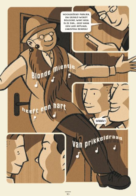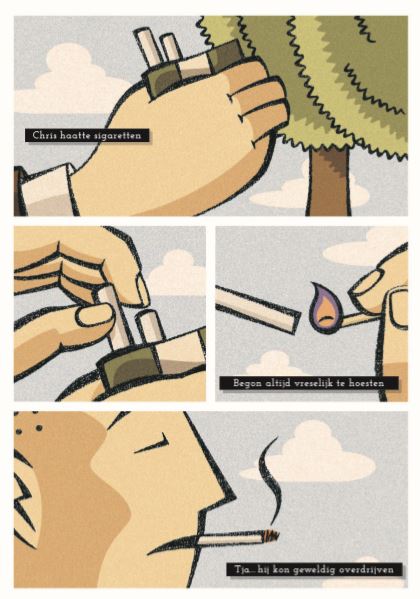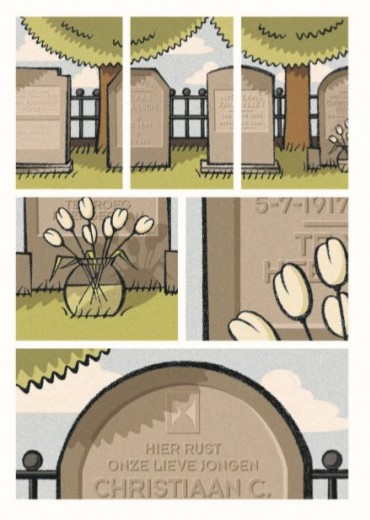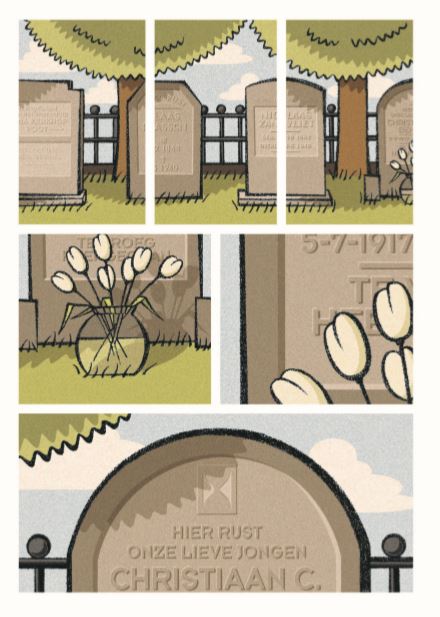 Victor en Esther ontmoeten elkaar een jaar na WO II op het kerkhof bij het graf van Christiaan Bender (25-5-1940). Beiden hebben ze hem gekend. Ze waren stapelverliefd maar hebben elkaar sinds de start van de oorlog niet meer gezien. Ze hebben dus heel wat te vertellen. Maar lukt dat zomaar? De tekeningen spelen de hoofdrol. Vandaar vele close-ups die de gevoelens versterken. De techniek van het inzoomen. Met deze 'atoomstijl' zie je ook de achtergrond van Erik de Graaf als grafisch ontwerper. De covers van Scherven en Littekens dienen naast elkaar gelegd te worden. Een wondermooi idee! De fijne korrelstructuur in de ingekleurde pagina's nemen ons zonder moeite mee naar die tijd. We leren gewone mensen kennen in oorlogstijd, een rare tijd dus! Victor gaat uiteindelijk bij het verzet en Esther Buchner - een uit Duitsland gevluchte Joodse - moet samen met haar zusje Ruth onderduiken. Esther heeft het niet onder de markt op haar onderduikadres en ziet bovendien dat haar zusje meegenomen wordt door Duitse soldaten en de oorlog dus niet zal overleven. Als het er echt op aankomt, kies je voor jezelf. Victor rent immers ook meteen weg toen Chris werd neergeschoten. We krijgen te maken met verraad, afrekeningen, zelfverwijt,... Esther: "We zijn bevrijd... maar ik voel me nog steeds gevangen." Hebben ze te veel meegemaakt? Mogen ze nog dromen? Hebben ze nog toekomst? En toch is er nog hoop!