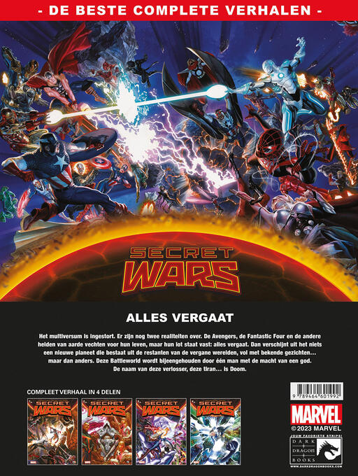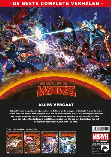 deel 1/4 Het Marvel Universum bestaat niet meer! De interdimensionale Incursies hebben alle dimensies één voor één geëlimineerd. Hierdoor zijn het Marvel Universum en het Ultimate Universum met elkaar in botsing gekomen en vernietigd! Nu is alles wat er in de uitgestrekte lege kosmos bestaat een enkele gigantische lappendeken van planeten, gemaakt van de gefragmenteerde overblijfselen van honderden verwoeste dimensies: De Battleworld! De overlevenden van deze multiversale catastrofe moeten leren overleven in dit vreemde nieuwe rijk! Welke vreemde wezens wonen in deze wereld? Welke bekende gezichten keren terug? En wat gebeurt er als de verschillende rijken ten strijde trekken? Het Marvel Universum is dood... en de overwinnaars van de Secret Wars zullen bepalen wat er daarna gebeurt!