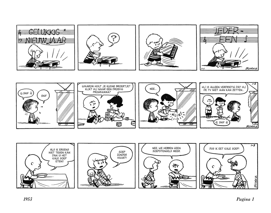 Twee complete jaargangen Snoopy (Peanuts) gebundeld en opnieuw vertaald. Begin jaren 50 maken we voor het eerst kennis met de wereld van de jonge Charlie Brown en zijn slimme hond Snoopy. Ook maken we kennis met al hun diverse vrienden. In die jaren hebben de hoofdfiguren nog niet allemaal hun kenmerkende uiterlijke trekken en herkenbare karakters, maar door de meesterlijke wijze waarop bedenker en tekenaar Charles M. Schulz de karakters neerzet sluit Amerika al snel Snoopy & Peanuts in het hart. En het duurt dan natuurlijk ook niet lang voor de rest van de wereld volgt. Voor het eerst wordt Snoopy & Peanuts compleet in het Nederlands uitgegeven. Meer dan de helft van de stroken in dit boek zijn sinds hun oorspronkelijke verschijning, een halve eeuw geleden, nooit meer in druk verschenen! Zelfs voor de meest toegewijde Peanuts-fan zijn er dus nog vele juweeltjes te ontdekken.