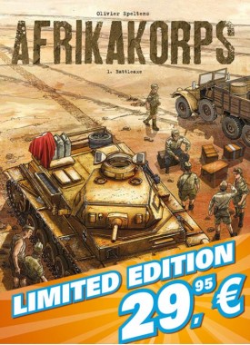 Verzamelaars en liefhebbers van het werk van Olivier Speltens willen deze Luxe Editie absoluut niet missen! - Luxe hardcover 'Afrikakorps' deel 1 met andere covertekening - Linnen rug - schetsdossier - 1 door Olivier Speltens gesigneerde A4 ex-libris - oplage slechts 100 exemplaren, genummerd, OP=OP! In februari 1941 arriveert luitenant Joachim von Richter met zijn mannen in Afrika. Deze panzercommandant trekt te strijde op een nieuw front in Noord-Afrika. De hitte en het zand zijn er even geducht als de Engelse troepen die er gestationeerd zijn. Er wacht de bemanning van de 522-tank een zware strijd, maar de orders zijn duidelijk, Tobroek moet worden ingenomen! Het Afrikakorps (Deutsches Afrikakorps, DAK) was tijdens de Tweede Wereldoorlog het expeditieleger van de Duitsers in Noord-Afrika. Het werd initieel gemobiliseerd als een ondersteunende kracht om de Italiaanse verdediging van de Afrikaanse koloniën te versterken. Na hun training bleven ze, onder het commando van de iconische maarschalk Erwin Rommel, onder verschillende namen vechten in Afrika en dat van maart 1941 tot hun overgave in mei 1943. Afrikakorps is een drieluik van Olivier Speltens (De hel van het Oostfront). Afrikakorps is een drieluik van Olivier Speltens (De hel van het Oostfront).