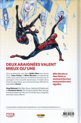 Pour la première fois, Peter Parker et Miles Morales font équipe de façon officielle dans une série. Il faudra bien deux Spider-Man pour s'opposer au Chacal ! Il y aura des batailles mais aussi de l'amour puisque Miles et Kamala Khan sortent ensemble, en même temps que Peter et... Gwen Stacy ! ? Humberto Ramos (Champions) fait partie des dessinateurs les plus durablement associés à Spider-Man et c'est toujours un évènement de le voir dessiner le personnage... alors, deux, vous pensez ! Il est associé ici à Greg Weisman, scénariste de la série animée Spectacular Spider-Man !