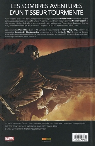 Aux heures les plus noires de la Grande Dépression, le jeune reporter Peter Parker découvre les ravages de l'injustice et de la corruption à New York. Personne ne semble en mesure d'arrêter Norman Osborn, le plus puissant criminel de la ville, et ses hommes de main. Mais, un jour, Peter est mordu par une étrange araignée et hérite d'incroyables pouvoirs. Il comprend alors qu'il a peut-être un rôle à jouer... - Les scénaristes David Hine (Son of M, Daredevil : Redemption) et Fabrice Sapolsky, associés au dessinateur Carmine Di Giandomenico, réinventent le mythe de Spider-Man. Découvrez dans ce volume des aventures originales et captivantes situées dans les années 30, à travers deux mini-séries et trois épisodes brefs, dont un inédit.