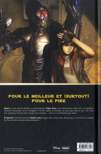 Aphra et son ancien droïde, le psychopathe Triple Zéro, sont désormais reliés par un système explosif redoutable : s'ils s'éloignent l'un de l'autre, le résultat ne sera pas beau à voir ! Ils n'ont que quelques heures pour trouver une solution avant de mourir... s'ils ne s'entretuent pas avant ! Dans ce nouveau tome des aventures d'Aphra, nous retrouvons le coscénariste des tomes précédents, Si Spurrier, et Emilio Laiso, un dessinateur habitué de la franchise. Ce dernier a en effet, signé des épisodes de Docteur Aphra, de Star Wars ainsi que l'adaptation en comics de Rogue One : A Star Wars story.