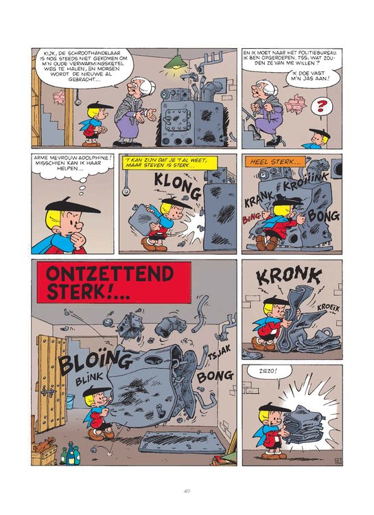 Steven Sterk lijkt een jongen zoals alle andere jongens van zijn leeftijd ... Maar schijn bedriegt. Steven is onvoorstelbaar sterk en iedereen die slechte bedoelingen heeft, krijgt er flink van langs. Tenminste ... als hij niet verkouden is, want dan verdwijnt zijn kracht als sneeuw voor de zon. Misschien draagt hij daarom altijd die blauwe wollen sjaal. Een van de grote klassiekers uit het stripverhaal, geschreven en getekend door Peyo, de geestelijke vader van De Smurfen en Johan en Pirrewiet. Deze prachtige hardcover bundelt drie verhalen en wordt ingeleid met een uitgebreid dossier boordevol weetjes en achtergrondinformatie.