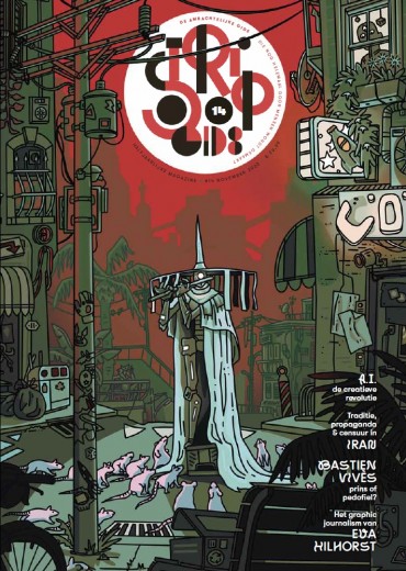 Relevantie troef, in deze nieuwe editie van het halfjaarlijkse literaire magazine Stripgids. Het 140 pagina’s dikke nummer belicht andermaal een waaier van boeiende onderwerpen en thema’s die zich situeren achter en voor de schermen van de stripsector. Zo is er de vrees dat artificiële intelligentie (A.I.) onder stripauteurs een bloedbad zal veroorzaken: zowel scenario’s als grafisch werk – in elke stijl of genre – kunnen moeiteloos met een paar prompts worden gegenereerd. Of loopt het allemaal niet zo’n vaart? Verder werpen we de vraag op of Iran een stripland is. De censuur drukt er loodzwaar op maatschappij, en dus ook op de wereld van strips en comics. De onderdrukking van meningsuiting en communicatie door het islamitische regime komen regelmatig in het nieuws. Maar over strips blijft het doodstil. Met dit nummer van Stripgids komt daar eindelijk verandering in. In deze editie krijgt Eva Hilhorst carte blanche voor het auteurskatern. Hilhorst is een bekende journaliste. Pardon, graphic journalist. Ze trekt er met collega’s als Judith Vanistendael op uit om complexe thema’s – vluchtelingen, oorlogen, het klimaatvraagstuk enz. – in beeld te brengen en inzicht te bieden. Ze doet dat op een slimme en genuanceerde manier. De cover is deze keer van de hand van Sterric - illustrator, game designer en stripmaker. Zij publiceerde haar debuut De vloek van rood in 2021. Met verder ook: Bastien Vivès, Tomi Ungerer, Norbert Moutier, Ype Driessen, Joke Van Leeuwen, Dieter Steenhaut en vele anderen.