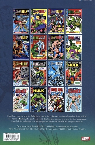L'un des plus anciens personnages Marvel est de retour ! Le Prince des Mers protège le royaume sous-marin d'Atlantis, et il a fort à faire car la menace peut venir aussi bien du fond des mers que de la surface ! Et face à Hulk, Namor risque de trouver un adversaire à sa mesure ! NOTES DE L'EDITEUR Cet album contient les derniers épisodes tirés de la série Tales to Astonish, au cours desquels Stan Lee transmet le flambeau à Roy Thomas et où Bill Everett, créateur du personnage, confie le dessin à de nouveaux talents.