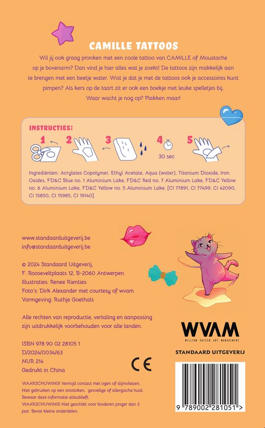Si vous êtes fan de CAMILLE, ces tatouages sont faits pour vous. Bien sûr, ce ne sont pas de vrais tatouages, nous ne voulons pas effrayer les parents. Choisissez le design que vous souhaitez et en un rien de temps, vous aurez de magnifiques tatouages sur vous et vos amis. Les tatouages restent sur votre peau pendant quelques jours. Il y a aussi un livret avec des jeux amusants. Avec de nouveaux tatouages et des photos de l'album Magie