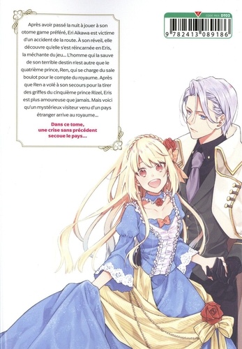 Après avoir passé la nuit à jouer à son otome game préféré, Eri Aikawa est victime d'un accident de la route. A son réveil, elle découvre qu'elle s'est réincarnée en Eris, la méchante du jeu... L'homme qui la sauve de son terrible destin n'est autre que le quatrième prince, Ren, qui se charge du sale boulot pour le compte du royaume. Après que Ren a volé à son secours pour la tirer des griffes du cinquième prince Rizel, Eris est plus amoureuse que jamais. Mais voici qu'un mystérieux visiteur venu d'un pays étranger arrive au royaume... Dans ce tome, une crise sans précédent secoue le pays...