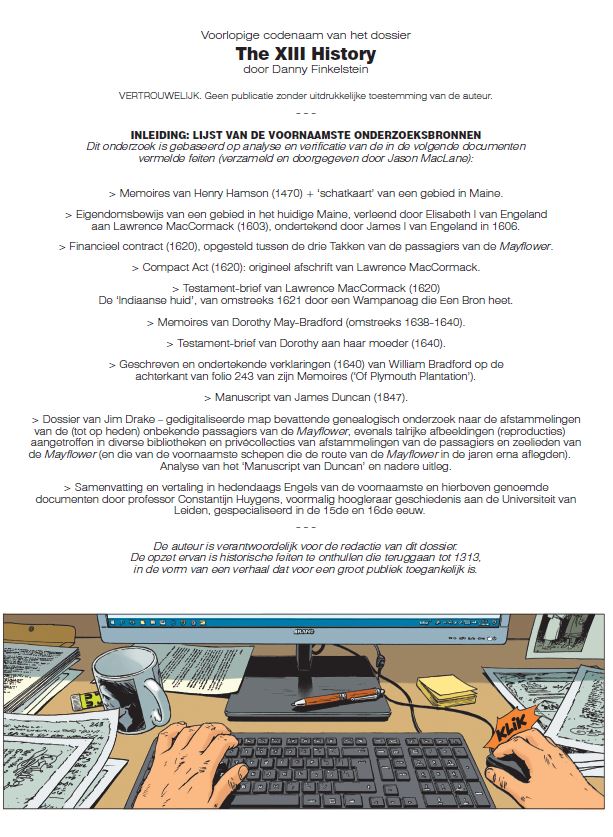The XIII Hystory deel 2 Met dossiers en achtergronden over de gebeurtenissen en personages van de Mayflower cyclus (deel 20 tem 24). Deze tweede cyclus start bij de overname van Sente (scenarist) en Jigounov (tekenaar).