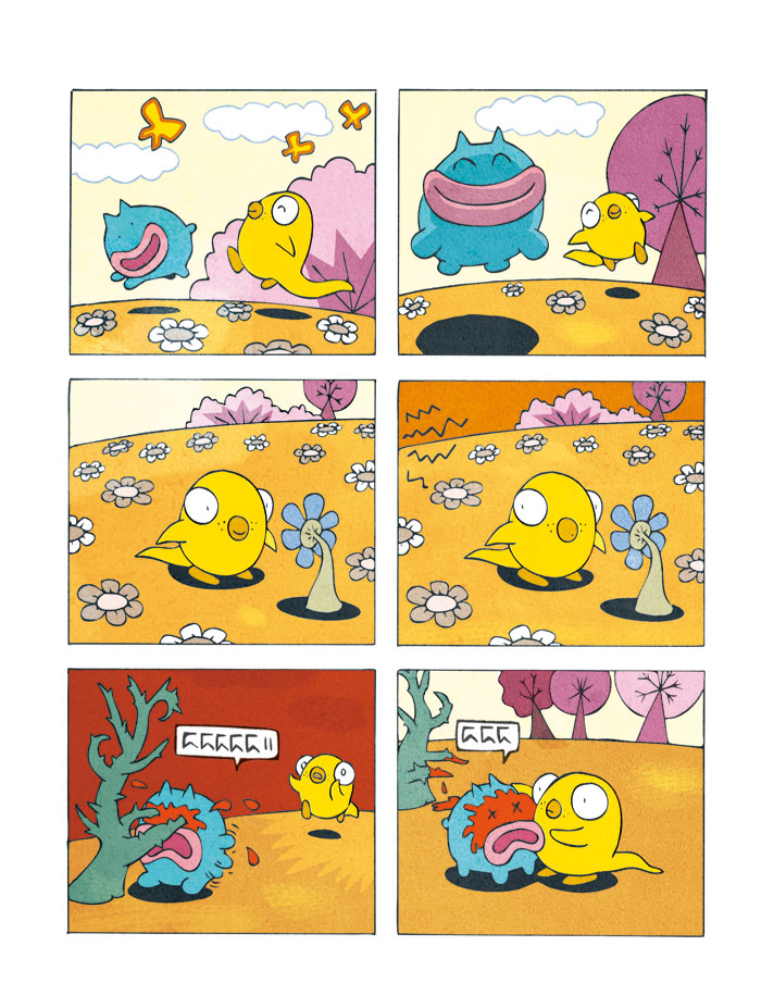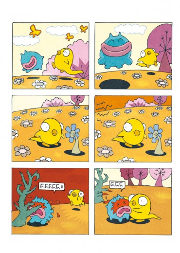 Onderweg van Japan naar Frankrijk tekende Lewis Trondheim de eerste schetsen van zijn nieuwste boek Buitenaards. Het wel en wee (met de nadruk op het wee) van de bont gekleurde monstertjes op een niet nader benoemde planeet ademen onmiskenbaar de sfeer van de populaire Japanse pop-cultuur maar ze passen ook perfect binnen het Trondheim-universum. Buitenaards is tekstloos (de aliens spreken wel, maar de teksten in de balloons zijn tot op heden niet ontcijferd), kleurig en een hoogtepunt in het oeuvre van de Franse tekenaar. Lewis Trondheim (1964) behoort tot de invloedrijkste striptekenaar van het moment. Hij won alle prijzen die er te winnen zijn en hij is in Frankrijk al geridderd tot chevalier des arts et lettres. Hij tekent en schrijft nu vijftien jaar strips en zijn productie is indrukwekkend. Zijn boeken zijn in vele talen vertaald, tot en met het Japans. Hij heeft een strip over het leven van een vlieg (hoe die uit zijn eitje komt en zijn wereld, de keuken, verkent), een strip over de oorsprong van het universum en het leed in de wereld en dan nu deze buitenaardse strip.