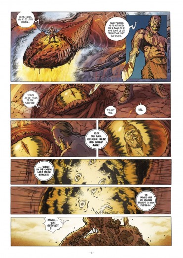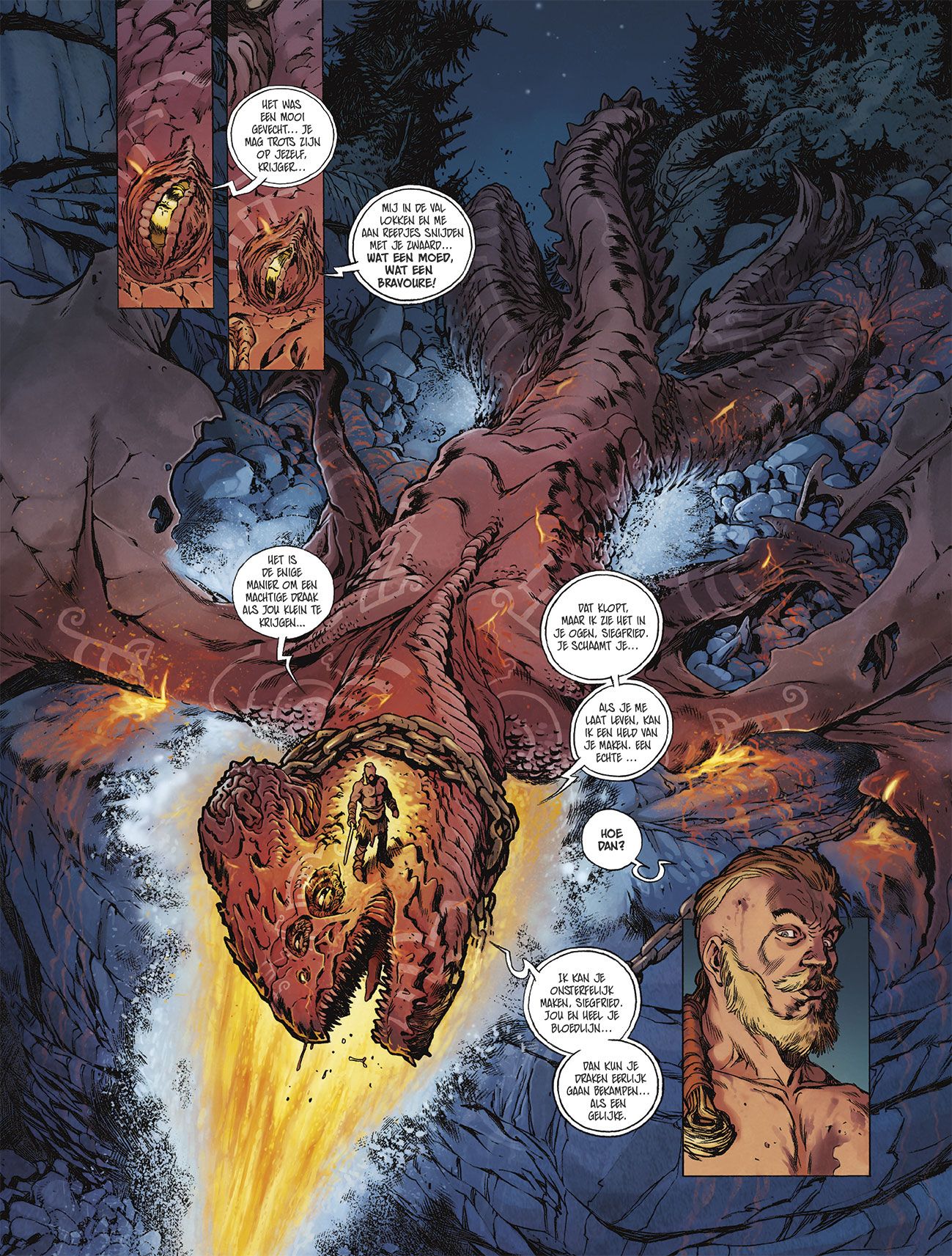 Score moyen 4 / 5Waar er draken zijn, is er vuur. Dat zou zomaar een waar gezegde kunnen zijn, mochten draken effectief bestaan… Het verhaal vangt aan als we getuige zijn van Siegfried, een drakendoder, die net een draak heeft bedwongen. De draak gooit het op een akkoord met Siegfried en probeert hem te overtuigen hem niet te doden in ruil voor onsterfelijkheid. Als Siegfried hem in de ogen kijkt, wordt de huid van Siegfried getransformeerd in een ondoordringbaar pantser. Daarop doodt hij de draak, maar is hij en zijn nageslacht voor altijd vervloekt met deze eigenschap. Jaren later volgen we het verhaal van Udo, de zoon van Siegfried die samen komt met 2 zielsverwanten. Samen willen ze jagen op de grootste draak ooit. Deze verschuilt zich echter in de zee en door zijn immense grootte, wordt dit dus verre van een evident avontuur. Een bezoek aan de binnenkant van de draak is onontkomelijk.. Meestal worden draken geassocieerd met vuurspuwende wezens en dat is meteen hun grootste gevaar. Dit album gaat echter een stapje verder en voegt er onder andere ook de gevaarlijke blik (draak komt van het Griekse ‘Drakon’ wat een afgeleide van ‘staren’ is) aan toe die je kan betoveren. Dit is 1 van de vele interessante zaken die het verhaal spekken. Scenarist Mathieu Gabella (De beul, De eenhoorn, Zij schreven geschiedenis,…) gaat verder dan het klassieke beeld die we van draken kennen en bouwt er een leuk verhaal rond. Zo hebben draken elementen in hun lichaam die speciale gaven bieden en haalt hij niet enkel vliegende draken naar boven, maar ook zeedraken en hybrides (half draak-half andere wezens). Via flashbacks komen we telkens meer te weten over het leven van Udo waarbij het verhaal meer diepgang krijgt. Dit alles is omkaderd in een prachtige, sfeervolle omgeving door de hand van nieuwkomer Christophe Swal en inkleurder Simon Chamelovier (Zeven, Walkyrie,..). Zo wordt de binnenkant van de draak origineel weergegeven: een gewelfd gehemelte, een omgekeerde kathedraal als huig, … het maakt het zowaar interessant om daar een kijkje te gaan nemen. Dit is een mooie springplank naar een nieuwe reeks die hopelijk blijft te onderhouden zoals dit eerste album. Knap staaltje fantasie !