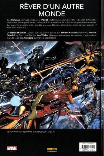 Les Illuminati ont réussi à repousser Thanos, mais les incursions d'ennemis venus d'autres dimensions continuent, amenuisant le nombre de solutions pour les repousser. Le groupe de super-héros réussira-t-il à rester soudé face aux décisions déchirantes qu'il va devoir prendre ? Rien n'est moins sûr... Jonathan Hickman (X-Men, S. H. I. E. L. D.) est épaulé par Simone Bianchi (Wolverine), Valerio Schiti (Tony Stark : Iron Man) et Kew Walker (Avengers Arena) pour ce nouveau chapitre de sa grande saga Avengers conduisant à Secret Wars.