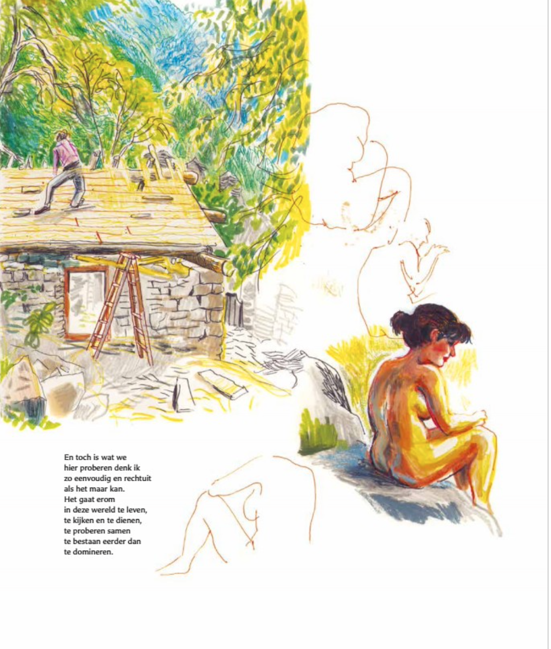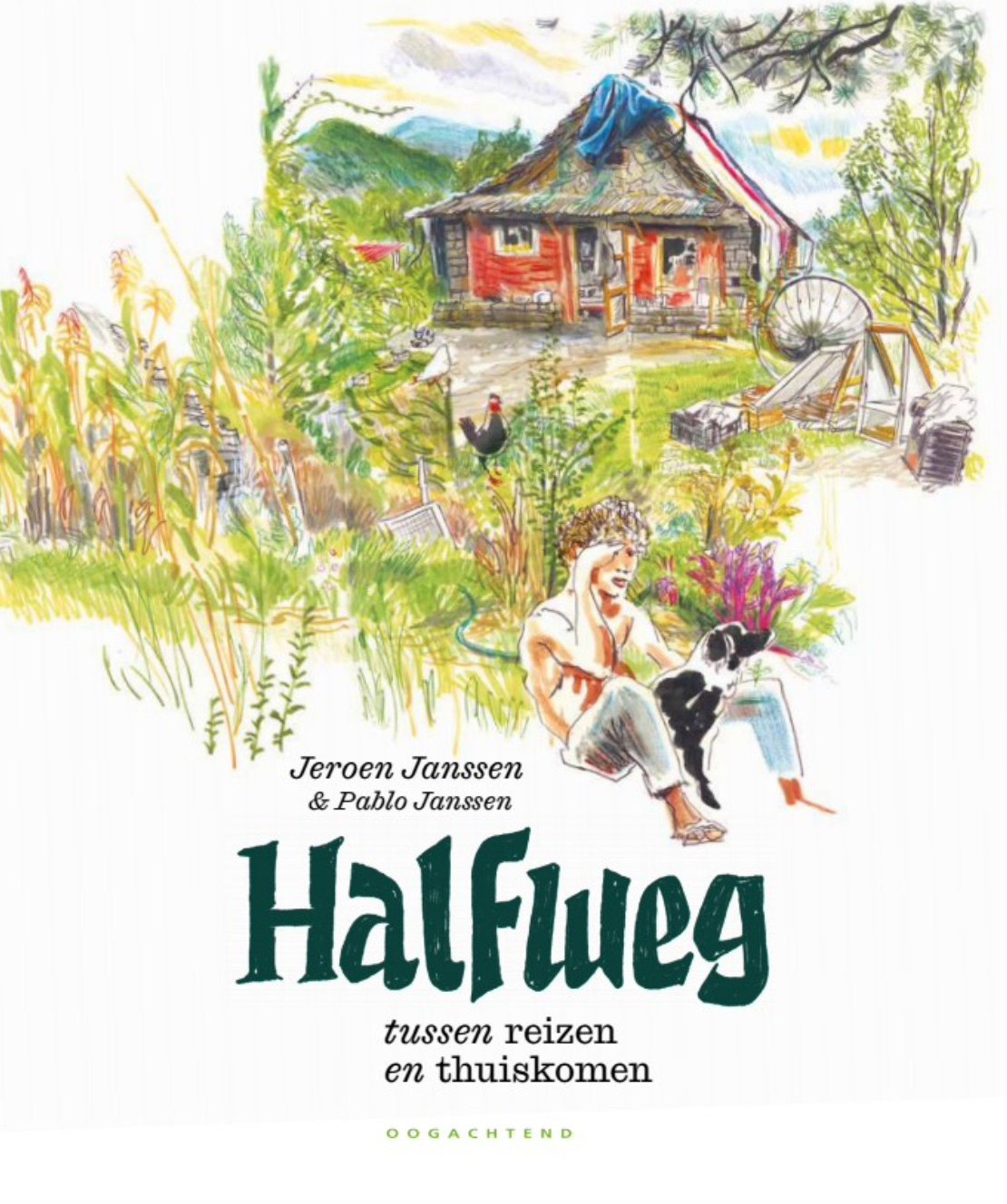 Dans son nouveau roman graphique Halfweg, Janssen explore l’essence du lieu où nous atterrissons. Un foyer est-il plus qu’une maison ? Qu’est-ce qui transforme un empilement de pierres, une cabane bricolée dans les bois ou un cercle de chaises blanches autour d’un feu de camp en un espace habité, animé d’une âme ? Janssen s’interroge : le chez-soi est-il enraciné en un lieu précis ou le portons-nous simplement sur notre dos ?