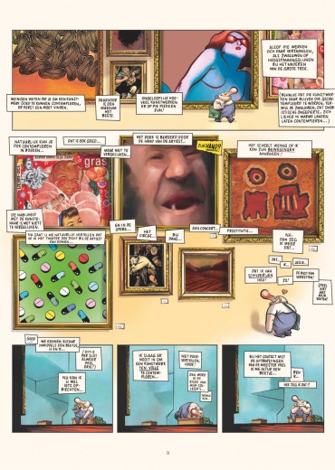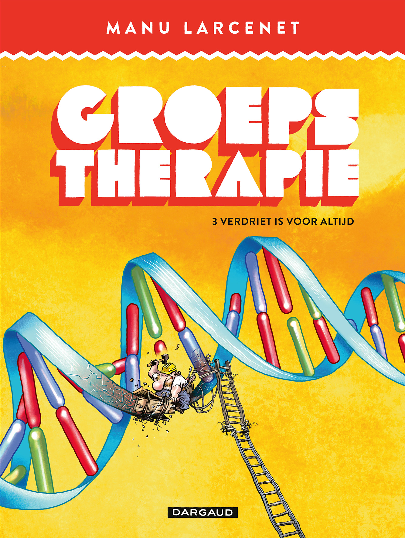 Groepstherapie is een schitterend verhaal van Manu Larcenet over een stripmaker – niemand minder dan Larcenet zelf – op zoek naar inspiratie. In een voortdurende zoektocht doorkruist hij de wereld van de creatie. Hij duikt de geschiedenis in, doet een oproep aan de grootste schilders, raadpleegt Boileau, Nietzsche en God Himself. Niet elke dichter kan humor met wanhoop rijmen, en toch slaagt Manu Larcenet net daarin met dit grappig, ontroerend en opzienbarend album. Hij maakt van elke tekening, elke pagina, elke tegenslag een hilarisch en aangrijpend moment. Tegenover de benauwing van de creatie plaatst hij zichzelf, naakt, zonder veinzerij of trukendoos. Hij trekt op een prachtige ontdekkingstocht, doordrongen van verrassende humor en een hartverscheurende waarheid op zoek naar de goddelijke inspiratie, of eender welke inspiratie, gewoon… al is het maar een miniem stukje inspiratie… iets… want zonder inspiratie is een kunstenaar niets. Manu Larcenet toont zich in Groepstherapie weer meester van de humor en creëert een unieke sfeer die je als lezer meteen meetrekt, recht naar de afgrond die gaapt voor de voeten van de inspiratieloze artiest.