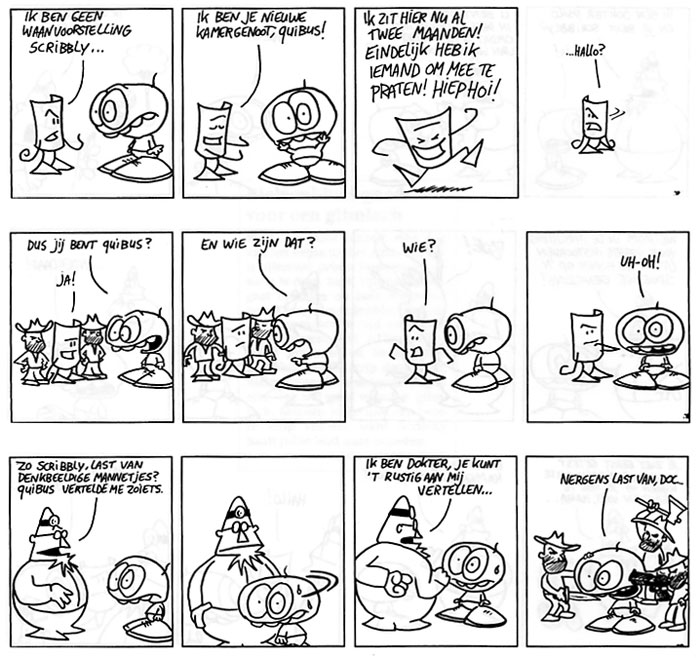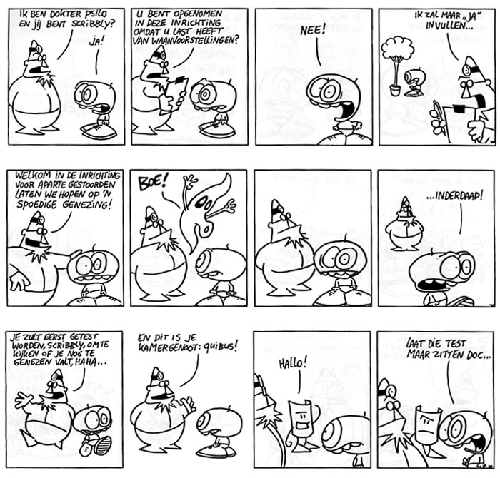 In dit eerste album worden alle personages op een speelse manier voorgesteld aan de lezer. Het leuke van Scribbly is de manier waarop de verschillende personages spelen met de lezer. Ze zijn zich er namelijk wel degelijk van bewust dat ze in een krantenstrip staan. Veel lezers begrijpen niets van de humor en uitten hun ongenoegen daarom geriefelijk op de brievenpagina van dagblad Metro. Door soms via de personages in de strip weer te reageren op de ingezonden brieven ontstaan er hilarische grappen. Een briljante vondst van tekenaar Jean-Paul Arends! Verder bevat dit met 100 pagina's gevulde album een sneltreinvaart aan gortdroge grappen die het lach-of-ik-schiet niveau ver overstijgen. Treinreizigers hebben Scribbly al in hun harten gesloten, nu de rest van Nederland nog.