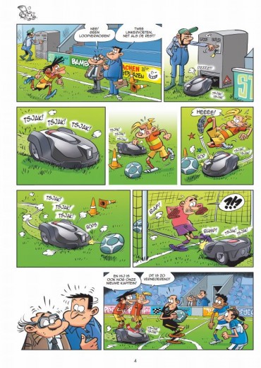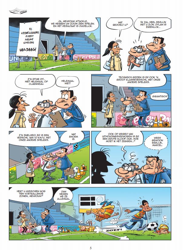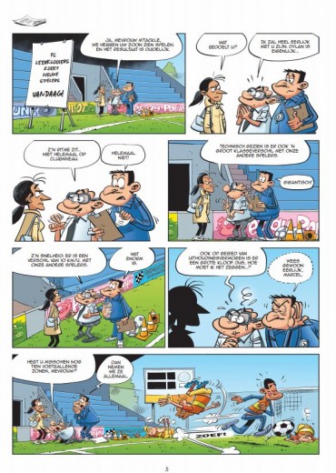 De officiële strip voor de fans van grasgroene velden! Trek je voetbalschoenen aan, want Voetbalgek staat weer te trappelen om het terrein te betreden! (Gemiste) doelkansen, (erbarmelijke) acties, (geveinsde) blessures, het palmares van FC Leerklooiers is nog altijd even leeg. Gelukkig heeft Marcel een geniaal idee: hij doet mee aan een wedstrijd om de kersverse wereldkampioen, Antoine Grozmann, te ontmoeten en zorgt ervoor dat die voor zijn club gaat spelen (of Grozmann nu wilt of niet)! Een vaste waarde in de Champions League van de humorstrip. Doelpuntenfestival voor je lachspieren! De officiële strip voor voetbalfans.