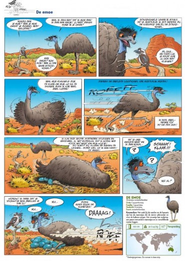 Score moyen 5 / 5Wist je dat de mannetjes bij de emoe de eieren uitbroeden en voor de kuikens zorgen? En dat het vrouwtje zo ondertussen kan paren met andere mannetjes en verschillende nesten kan leggen? Of dat een roodborstje zingt om z’n territorium af te bakenen en het niet zo voor andere vogels heeft? Of dat er ook een stinkvogel bestaat? Er bestaat zelfs een vogel die amper 5 centimeter groot is en minder dan 2 gram weegt! Al deze leuke weetjes kom je te weten in de nieuwe serie ‘Vreemde vogels’, geschreven door Jean-Luc Garréra , die eerder ook al de serie ‘Wielergek’ schreef. Het album start met wat een vogel juist is, de taxonomie en een beetje geschiedenis. Daarna krijg je een overzicht van verschillende soorten vogels die aan bod komen: elke vogel krijgt een eigen pagina met leuke weetjes verwerkt in een humoristische strip. Het magnifieke tekenwerk werd gemaakt door Alain Sirvent en ingekleurd door David Lunven en is zeker de moeite waard! Zeer gedetailleerde vogels die levensecht getekend werden en in heldere, prachtige kleuren werden ingekleurd. Bij enkele vogels werd onderaan ook het leefgebied in de wereld gesitueerd, samen met enkele kenmerken, de orde, de familie, het geslacht en de soort. Men koos dan telkens één weetje uit om een humoristische strippagina over te maken. De één-pagina-verhaaltjes zijn origineel en leuk bedacht. Bovendien komen er allerlei soorten vogels aan bod: wat dacht je van de fuut, de koekoek, de duif, de haan, de gierzwaluw… maar ook de rode ibis, de helmkasuaris, de uilnachtzwaluw, de lammergier, de blauwe reiger en nog veel meer andere soorten die aan bod komen in dit prachtige album. Bovendien komen we ook nog allerlei zaken te weten in verband met de vogeltrek, de snavels, de nesten … Als extraatje zit er nog een uitgebreid vogeldossier achteraan in dit album waar je nog meer leuke weetjes kan ontdekken. In dit eerste album van deze grappige, fascinerende én leerrijke reeks over vogels kom je werkelijk alles te weten dankzij de combinatie van wetenschappelijke feiten en een vleugje humor! Benieuwd naar de volgende delen!!