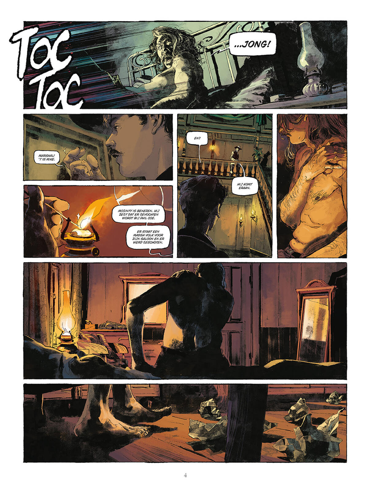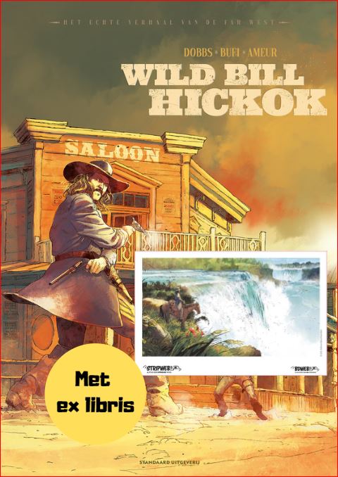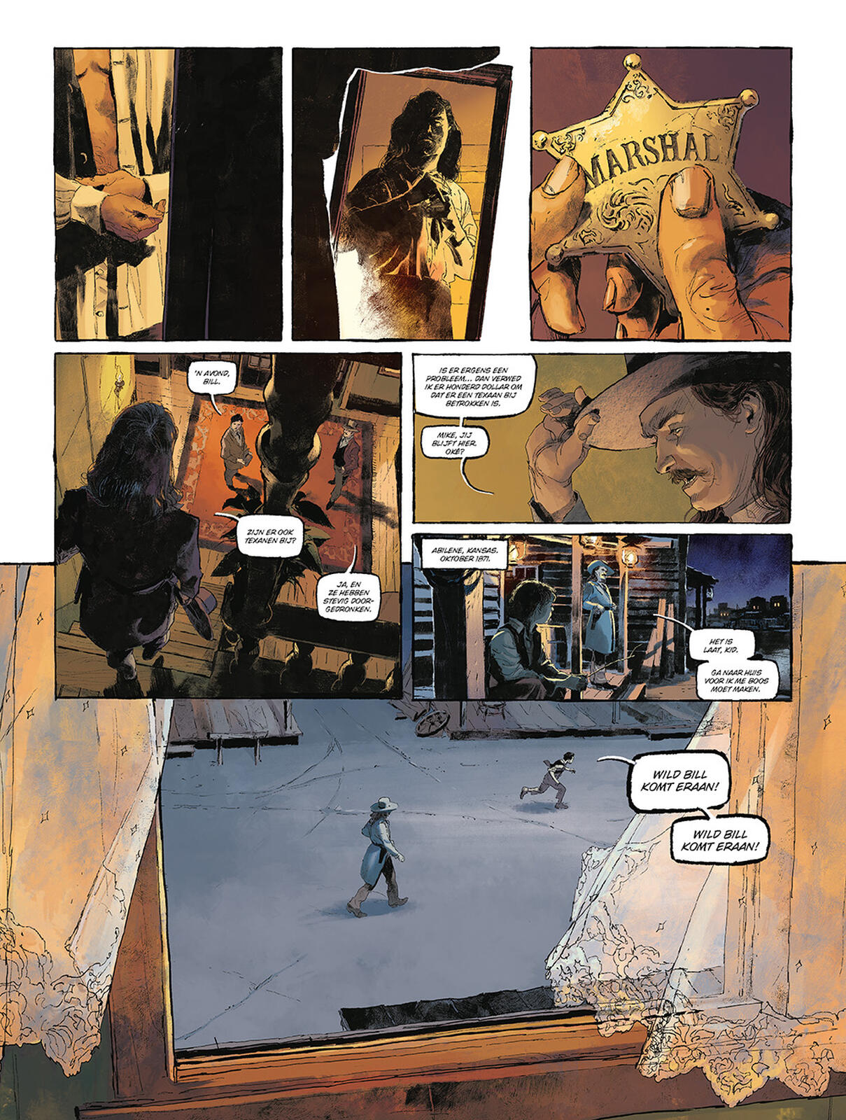 Score moyen 4 / 5Wild Bill, Buffalo Bill, Jesse James, Calamity Jane,… Allemaal klinkende namen, maar wie waren ze werkelijk ? In deze nieuwe reeks ‘Het echte verhaal van de Far West’ worden deze karakters 1 voor 1 uitgelicht. De mysterieuze James Butler Hickok werd geboren in 1837 in de staat Illinois als boerenzoon. Al snel wou hij op eigen benen staan en trok hij op pad zonder al te veel ambities. In dit album volgen we hem als hij meedoet aan shows waarbij hij zijn eigen leven naspeelt. Dit is echter niet zijn ding en hij besluit om terug contact op te nemen met zijn oude vriend ‘Buffalo Bill’. Intussen houdt Wild Bill zijn fameuze reputatie waar en weet hij indruk te maken door zijn schietkunsten bij duels of andere vechtpartijen. Echter is hij ook fan van poker, drank en vrouwen wat hem in een lastig parket brengt en niet ten goede komt. Zal dit uiteindelijk de ondergang worden van de beroemde schutter ? Scenarist Dobbs (Jesse James, Nicolas le Floch, Alamo,…) brengt ons een biografie over het leven van Wild Bill waarbij hij met flashbacks de gebeurtenissen van vroeger weet te verhalen. Dit is gebaseerd op waar gebeurde feiten waarbij weinig extra dramatiek wordt aan toegevoegd. Dit maakt het verhaal vrij lineair, buiten de duels die mooi in beeld gebracht worden. Tekenaar van dienst Ennio Bufi (Carthago, Vertigo,…) weet alles heel knap over te brengen; bij sommige actiescènes fluiten de kogels je bijna echt om je oren. Ook de inkleuring door Greg Lofé voelt heel ‘Far West’ en sfeervol aan. Achteraan wordt je nog getrakteerd op een extra dossier over het leven van Wild Bill, met heel wat aanvullende informatie. Dit is een mooie hommage worden aan ‘Wild Bill’, maar als je op zoek bent naar een avontuurlijk verhaal ben je beter af met andere reeksen, zoals bvb. ‘Wild West’.
