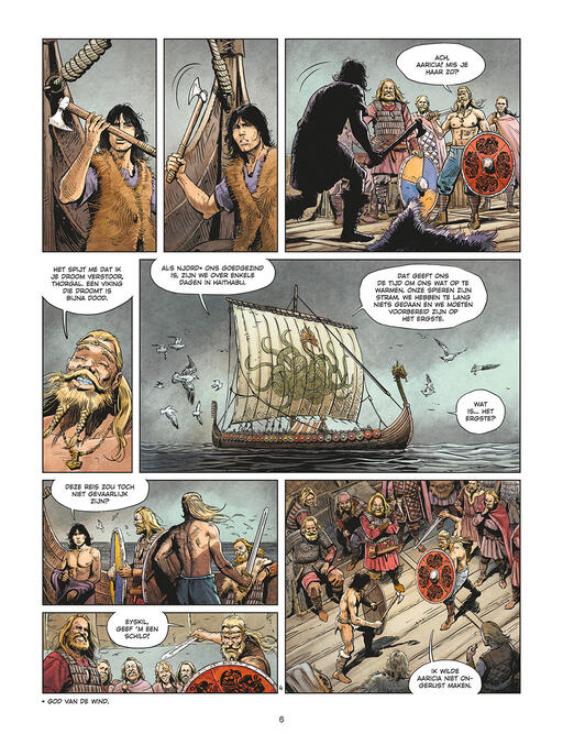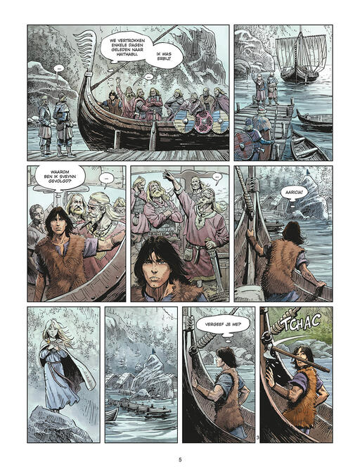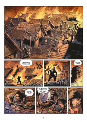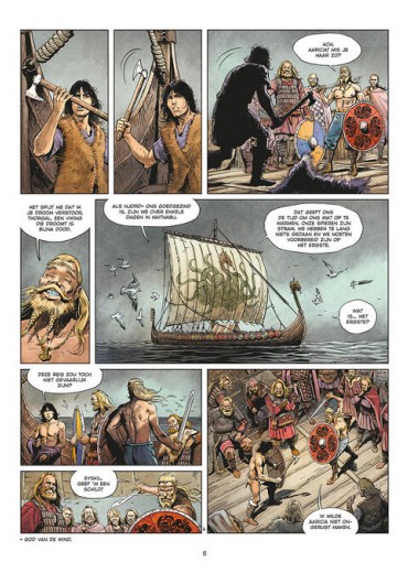 Score moyen 3 / 5De cover spreekt in ieder geval aan als je dit album aanschouwt; benieuwd of de inhoud ons ook weet te bekoren.. De naam Sydönia heeft om te beginnen niets met die andere stripfiguur te maken, integendeel zelfs. Sydönia is de jonge dochter van de onlangs overleden koning Harald (zie het vorige album in deze reeks), maar van dit overlijden is ze nog niet op de hoogte. Ze is het saaie leventje beu aan het hof en wil zelf het heft in handen nemen. Echter heeft haar moeder die koningin is, nog altijd de macht. Als mannen de huid van een geschoten beer door Harald binnenbrengen in het kasteel, blijkt deze huid te kunnen communiceren met Sydönia. Deze geest blijkt verwant met de bloedlijn van Sydönia, waarbij hij aan haar meldt dat Harald overleden is. Even later wordt dit bevestigd door een koninklijk handelsschip die terug is. De hoge raad van het kasteel komt dit ook te horen waarop Sydönia een deal sluit met hen om haar bastaardbroer Sveynn uit te schakelen, gezien deze nu de troon zal bestijgen. Even later komt de drakkar van Sveynn aan waarop Thorgal zich ook bevindt. Maar als ze de wallen binnen varen, blijkt het wel heel stil te zijn… verdacht stil. Weet Sveynn zich als koning uit te roepen, of lopen ze in de list van Sydönia…? Het scenario van dit deel is terug door Yann (Berentand, Black Squaw, Mezek,…) geschreven en weet terug iets meer te bekoren dan het vorige deel. Echter blijft de Thorgal-sfeer van weleer wat zoek, precies of de jonge jaren ook wat mager zijn qua verhaal. Het blijft allemaal vrij simpel: Sydönia neemt gemakkelijk de macht over, ze probeert haar broer Sveynn uit te schakelen, die op zijn beurt zijn deel doet,… Ok, er zijn een paar leuke extra’s op het eind maar het weet niet te overtuigen. Het tekenwerk van de hand van Roman Surzhenko blijft wel op een mooi niveau en doet geen afbreuk aan de reeks. De brute vikingen, de dreigende drakkars en de actie worden mooi in beeld gebracht. Verwacht geen heropleving van deze zijreeks, maar als je zin hebt in wat rauwe vikingactie blijf je wel goed zitten met dit album.