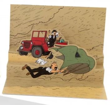 pop-up postkaart met wagens op het voorplan uit de avonturen van Kuifje. Geleverd met omslag