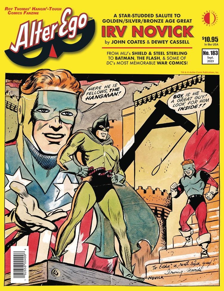Don't miss the wall-to-wall coverage of Golden/Silver/Bronze Age legend Irv Novick (artist of Shield, Steel Sterling, Batman, The Flash, and some of the great DC war stories) by John Coates and Dewey Cassell. It includes interviews with Irv and family members, tributes by Denny O'Neil, Mark Evanier, and Paul Levitz, Irv's involvement with painter Roy Lichtenstein (who used Novick's work as the basis for his paintings), and more! Plus Michael T. Gilbert in Mr. Monster's Comic Crypt, and FCA (Fawcett Collectors of America). Cover by Novick. Edited by Roy Thomas.