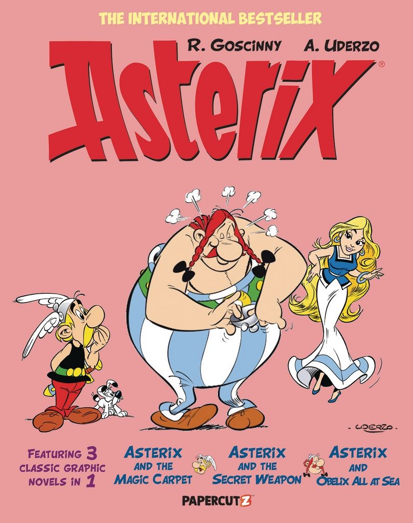 Asterix is a fearless Gaul with a magic potion that grants him incredible strength to protect his village and ward off the Roman Empire from invading. With his pal, Obelix, they not only defend their village from the blundering Roman legionairies, but also lend their services to the rest of the world. First, Asterix and Obelix and their tone-deaf bard Cacofonix attempt to bring rain to a far-off Eastern Kingdom in Asterix and the Magic Carpet. Asterix and Julius Caesar race head-to-head to implement their Secret Weapon to their forces and advance into a new age. Their futures are female. And finally, Obelix gets his hands on the magic potion and flees the village. Can the King of Atlantis help? Find out in Asterix and Obelix All at Sea. Plus: a new Asterix Afterword by Alexander Simmons, providing historical and cultural context, both in 50 BCE and in the time the classic comics were created.