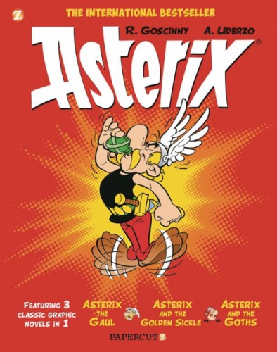 Opgelet, dit is een Engelstalige strip! Asterix is celebrating 60 sensational years as an international comics superstar, and in the first collected edition from Papercutz, the stories are newly translated into American English for a new generation of fans! The story of Asterix starts here. These are the first three adventures of Asterix as he defends his tiny village from the overwhelming forces of the Roman Empire. Join the short, spunky, and super-powerful warrior from Gaul and his faithful friends, -including the boar-eating delivery man Obelix and the ecologically-minded canine, Dogmatix, as they battle to protect their village against impossible odds. Asterix Omnibus volume one collects 'Asterix the Gaul,' 'Asterix and the Golden Sickle,' and 'Asterix and the Goths.' Three classic adventures in one great volume.