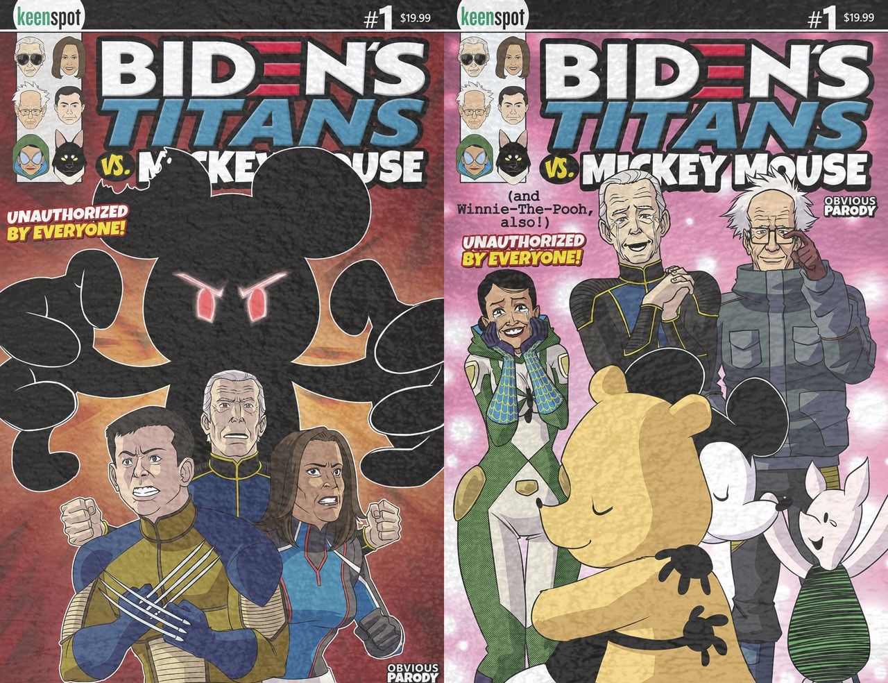 The totally unauthorized and unofficial crossover that's 95 years in the making! Your favorite non-defunct presidential superhero team, Biden's Titans, have previously battled monsters like Dracula, QAnon, and even Elon Musk! But nothing can prepare them for their next foe… Mickey Mouse?! (And Winnie-The-Pooh, also!) The public domain is to blame for this bonkers parody, which also introduces a new independent superhero: RFK Jr as… The Unvaxxed! Stare in slack-jawed awe as you read this magically stupid seventh chapter of Biden's Titans! (Includes bonus pull-out poster!)