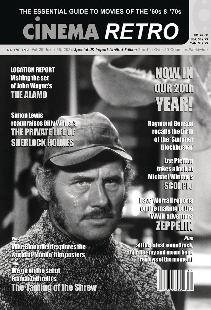 Cinema Retro enter its 20th year in publication packed with amazing articles from the era of film we all love. Mike Bloomfield celebrates the fantastic world of collecting 'Mondo' film posters, and Dave Worrall recalls the WWII action adventure Zeppelin (1971). We feature a Take Two 'Extra,' with Lee Pfeiffer revisiting Michael Winner's Scorpio (1973) and also feature a 4-page photo-spread of Franco Zeffirelli filming the Burton/Taylor version of Shakespeare's Taming of the Shrew (1967). Simon Lewis brings us a 10- page 'Film in Focus' on Billy Wilder's The Private Life of Sherlock Holmes (1970) and Dave Worrall and Lee Pfeiffer recall their visit to the Texan location of John Wayne's The Alamo (1960). All of this, plus our usual round-up of book, music and DVD releases and news, makes for another great issue.