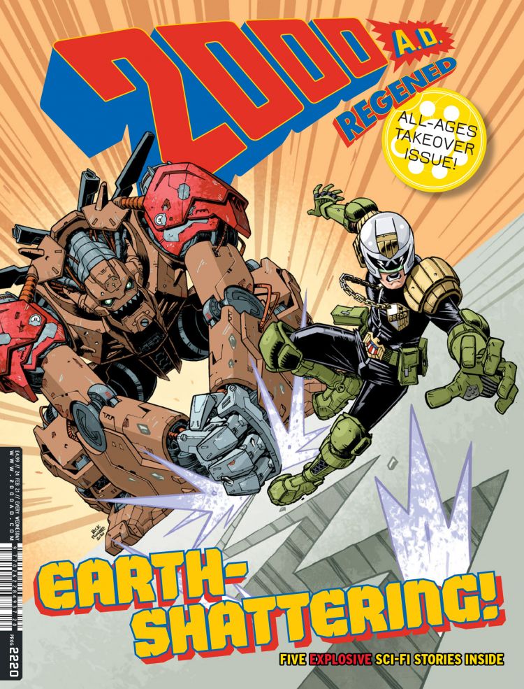 Incredible SF action from the Eisner-nominated UK anthology! In Progs 2217-2219, there's dragon battles in the sky for Celtic warrior Slaine in 'The Web of Weird' by Pat Mills and Leonardo Manco; Durham Red fights for her life in 'Served Cold' by Alec Worley and Ben Willsher; Hershey risks becoming ever more twisted in her desire for justice in 'The Brutal' by Rob Williams and Simon Fraser; Proteus Vex is caught in a conflict in 'The Shadow Chancellor' by Mike Carroll and Jake Lynch; and there's more future law enforcement with Judge Dredd! Prog 2220 is the first of 2021's 48pp Regened issues, the all-ages specials featuring both new and old characters. Cadet Dredd tackles another case, we meet the heroes of SF extravaganza Action Pact, learn about Mega-City One's most notorious cat-burglar, and more!