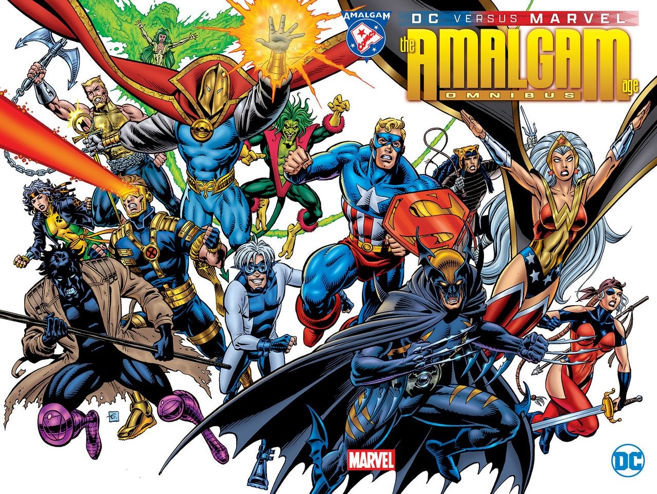 'Written by Ron Marz, Peter David, Karl Kesel, and Others Art by Dan Jurgens, Claudio Castellini, and Others Pitting their world's greatest superheroes against each other, only the winning universe will be allowed to live! And the loser...will cease to exist. Superman versus the Hulk! Batman versus Captain America! Wolverine versus Lobo! Fighting against the clock, Access, a new hero traversing both worlds, will attempt victory through another means: The combination of DC and Marvel into one universe! The Amalgam age of comics is born! Batman and Wolverine become Dark Claw! Captain America and Superman become Super Soldier! Wonder Woman and Storm become Amazon! But will the existence of Amalgam prolong the inevitable demise of DC or Marvel? Will the Amalgam Universe fight back when Access attempts to return the universes to their former glory? This once-in-a-lifetime event is finally collected in a once-in-a-lifetime Omnibus! Featuring DC Versus Marvel #1-4, the DC/Marvel: All-Access #1-4, Unlimited Access #1-4, Amazon #1, Assassins #1, Bat-Thing #1, Bruce Wayne: Agent of S.H.I.E.L.D. #1, Bullets and Bracelets #1, Challengers of the Fantastic #1, Dark Claw Adventures #1, Doctor Strangefate #1, Exciting X-Patrol #1, Generation Hex #1, Iron Lantern #1, JLX Unleashed #1, Legend of the Dark Claw #1, Lobo the Duck #1, The Magnetic Men Featuring Magneto #1, Speed Demon #1, Spider-Boy #1, Spider-Boy Team-Up #1, Super Soldier #1, Super Soldier: Man of War #1, Thorion of the New Asgods #1, X-Patrol #1, and a story from Green Lantern #87. Includes introductions by Ron Marz and Karl Kesel, new afterwords by Mike Carlin and Tom Breevort, the trading cards, and a tome of never-before-seen material!'