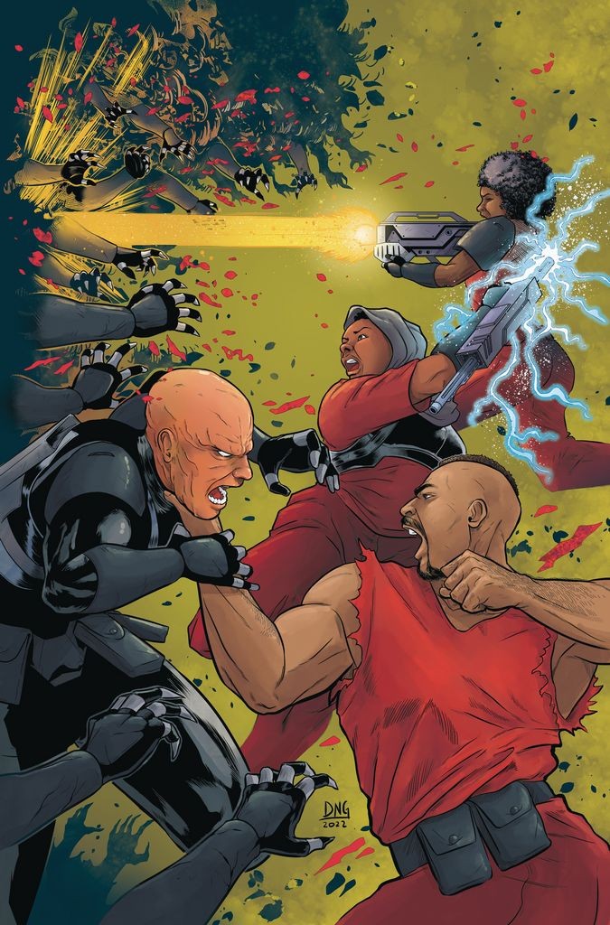 Divide continues with cover-to-cover prison break action in this double-sized chapter, presented in perfect bound, prestige format! The true danger of the demonic President's vitriol is revealed! Salim and Jaffer, must unite their fellow inmates in revolt if they stand any chance of escaping this detention center with their souls intact and finding a way home from the empty maw of uncharted space.