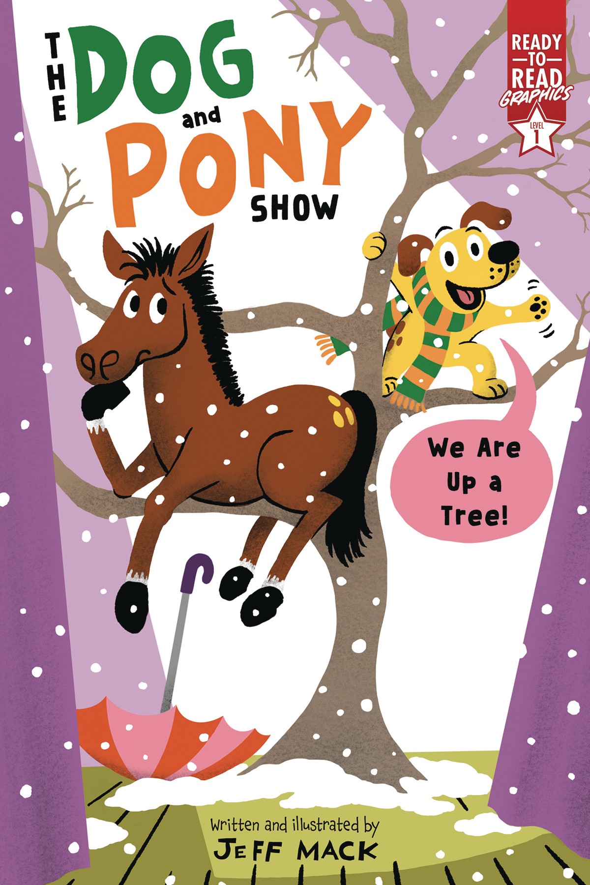 Dog and Pony get stuck in a tree in the funny second book in a Level 1 Ready-to-Read Graphics series by award-winning author-illustrator Jeff Mack! Dog wants to climb a tree. Pony helps, but then Dog is too scared to climb back down! So Pony goes up the tree, too. Now neither of them can get back down! Dog thinks they'll have to live in the tree forever, but Pony knows they can find a way back to the ground... even as it starts to snow.