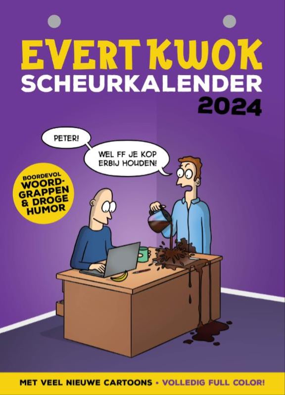 De Evert Kwok Scheurkalender 2024 is een absolute musthave voor de liefhebber van woordgrappen en droge humor. Zet je schrap voor een nieuw jaar boordevol kwokklassiekers, gloednieuwe cartoons en stripjes, überslechte (en dus goede) woordgrappen en absurde ongein van de woordgrappenkoning van de lage landen.