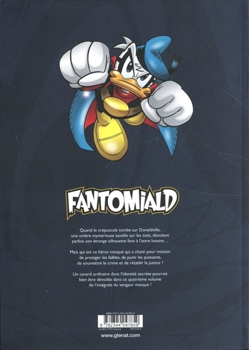 Quand le crépuscule tombe sur Donaldville, une ombre mystérieuse sautille sur les mirs, dévoilant parfois son étrange silhouette face à l'astre lunaire... Mais qui est ce héros masqué qui a choisi pour mission de protéger les faibles, de punir les puissants, de soumettre le crime et de rétablir la justice ? Un canard ordinaire dont l'identité secrète pourrait bien être dévoilée dans ce quatrième volume de l'intégrale du vengeur masqué !