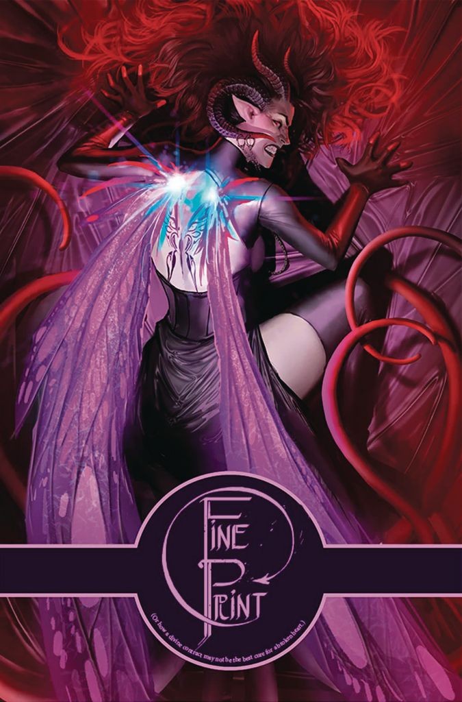 A tale of gods, mortals, love, lust, death, and bad decisions-that all starts with a simple bite of a golden apple. When Lauren signs the divine contract promising bliss for the price of love, she expects to be granted the services of the highest ranking god of desire. To everyone's surprise this is a contested title and what was supposed to be a simple routine transaction becomes a mess of divine legalities, competitiveness and harsh decisions that involve a higher power, and the higher power is not happy about it. In this game of carnal delights and absolute stubbornness lives may be at stake, especially when an ex-fury is put in an uncomfortable position that compromises the well being of her family. Welcome to FINE PRINT, VOLUME 2-this is where it gets weird.