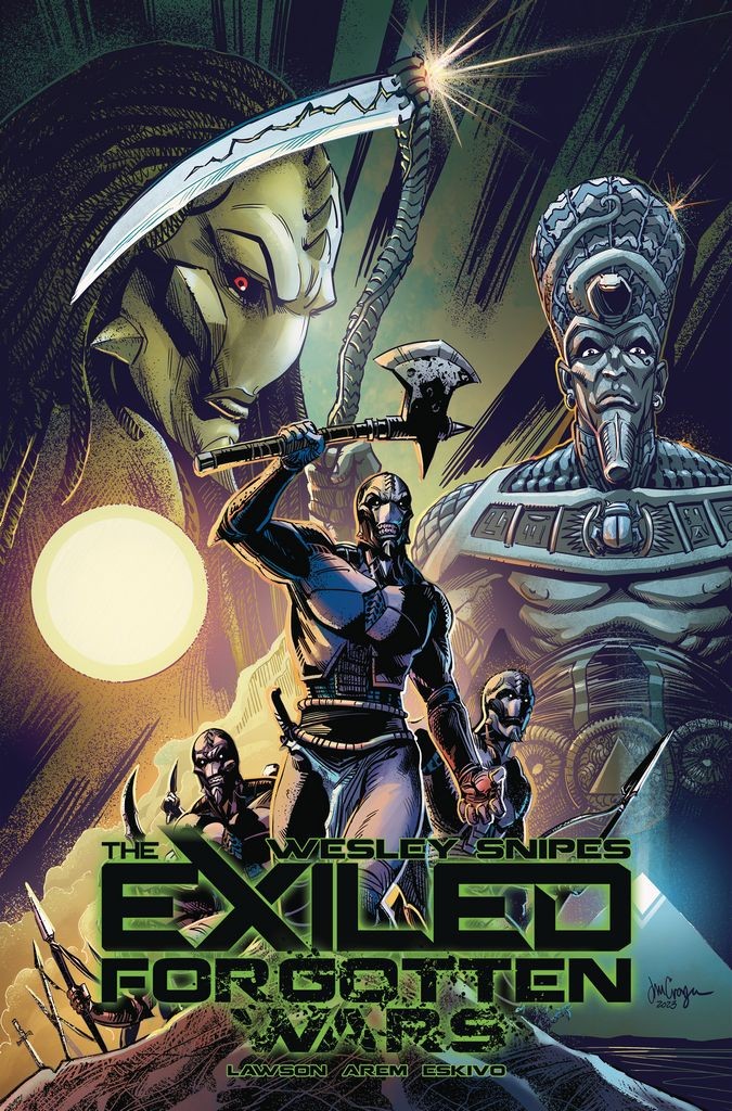 Cover by series artist Jason Crager, a veteran comic creator who has worked on such titles as Vampirella, Chains of Chaos, The Darkness, Avangeline, Coven, Badworld, Threshold, and The New X-Men. This standalone story from the world of The Exiled takes us to the era of the pharoahs, when the 'first' alien dropship arrived on Earth. Witness the origin story of the ancient conflict between humans and criminal aliens through the eyes of Kalyx, the Killer Detective Roach is hunting 5,000 years in the future. All is not well among the alien outcasts. Some were exiled for their religious convictions and others for their crimes. This struggle erupts into a civil war among the aliens, with Egypt caught in the middle of a war forgotten by time.