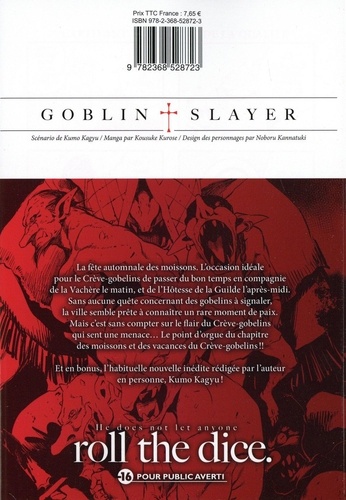 La fête automnale des moissons. L'occasion idéale pour le Crève-gobelins de passer du bon temps en compagnie de la Vachère le matin, et de l'Hôtesse de la Guilde l'après-midi. Sans aucune quête concernant des gobelins à signaler, la ville semble prête à connaître un rare moment de paix. Mais c'est sans compter sur le flair du Crève-gobelins qui sent une menace... Le point d'orgue du chapitre des moissons et des vacances du Crève-gobelins ! Et en bonus, l'habituelle nouvelle inédite rédigée par l'auteur en personne, Kumo Kagyu !