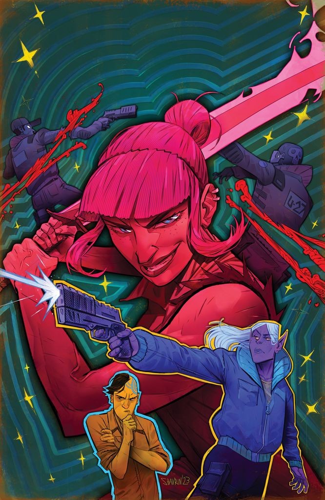 Cover by Ivan Shavrin, the series artist for Heavy Metal's Starward, plus published work by BOOM! Studios, Dark Horse, and Marvel. Gryffen's crusade of terror against the fascist Sovereign Reach has ignited the empire's wrath, and the fate of an entire planet hangs in the balance! Gryffen and their crew's quest to save the planet Ensara comes to a fiery climax, as the ruthless Admiral Hunter joins the fray! What secrets do Gryffen and Hunter share, and why is the admiral willing to spill an ocean of blood just to see Gryffen dead? If Gryffen wants to prevent a genocide, it'll take daring, fringe science, and a little bit of being shot into the cold void space.