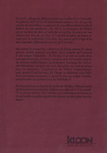 Toute naissance n'est pas une bénédiction... Dunwich, village en déliquescence aux confins de la Nouvelle-Angleterre, fait l'objet de nombreuses rumeurs. On dit que les cercles de monolithes au sommet de ses collines étaient jadis le théâtre de rites terrifiants... En 1913, la naissance de Wilbur est un mystère de plus sur cette terre maudite. Sa mère est une albinos aux airs de sorcière, et l'identité du père est tenue secrète par le patriarche Whateley, qui assure qu'il s'agit d'un être supérieur, différent de tout ce qu'il connaît... Les voisins le croient fou, néanmoins le faciès animal du jeune garçon semble appuyer ses dires. Sans compter qu'il grandit à une vitesse fulgurante... A dix ans, il se met en quête d'un ouvrage ésotérique, le Necronomicon, dont il s'enquiert auprès de diverses bibliothèques. Le professeur Armitage de l'université Miskatonic, intrigué par cette demande, se rend sur place pour le rencontrer. L'intelligence de Wilbur l'impressionne, mais quand il voit les murs de l'étage se déformer sous l'effet d'une puissance inconnue, il repart la peur au ventre ! Quelles monstruosités se cachent chez les Whateley ? Réunissant plusieurs figures du mythe de Cthulhu, L'Abomination de Dunwich est une des plus célèbres nouvelles de H. P. Lovecraft. De sa plume acérée, Gou Tanabe nous embarque sur les traces d'une famille maudite capable de donner vie aux pires cauchemars !