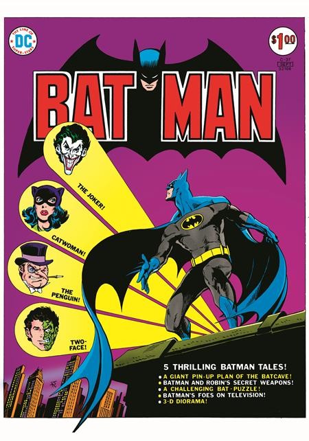 'Art by Bob Kane, Jerry Robinson, George Roussos, Jim Mooney, Ray Burnley, Frank Springer, Win Mortimer and Jack Burnley A special all-villain issue featuring five thrilling tales of Batman fighting his greatest enemies, reprinted for the first time ever and in its original size as a full facsimile edition. A Batman tabloid extravaganza with pinups, puzzles, activity pages, and a back cover tabletop diorama that you can cut out and display.'
