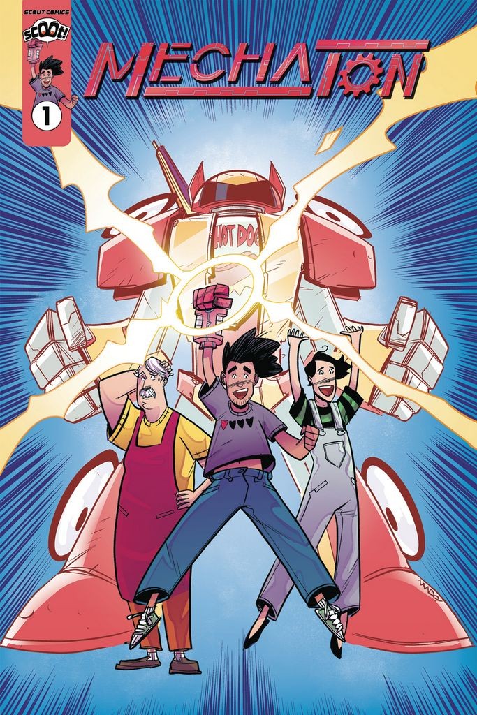 Scoot Imprint! Derek and Leah don't really have a plan. All they know is that video games are awesome and that you should always look out for your neighbor. But when giant mutant insects start terrorizing the neighborhood, they'll have to get off the couch and do something about it. Luckily, everything they need just fell out of the sky: The MechaTon Glove, a machine that converts anything it punches into a battle mech, whether it's a hotdog stand or a house. Here's hoping they don't lose their heads trying to do the right thing!