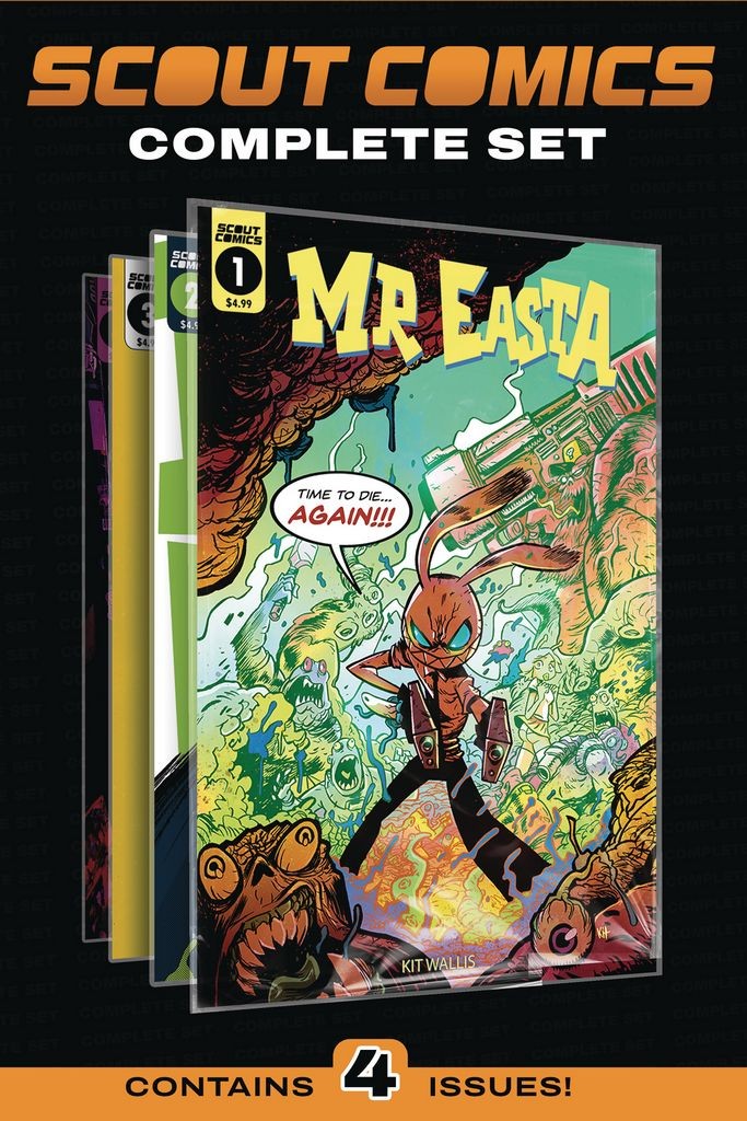 This beautifully designed hangable package (measures 8 1/2' x 12 3/4') includes all three issues (bagged and boarded) of the hit Scout series! Mr. Easta has to repay his debt to Intergalactic Warlord Dr. Bone by scouring the universe for the targets on his hit list. This adults-only romp through time and space sees Easta and Frank soon establish that a sinister coincidence exists between the targets on the list. They are all members of the powerful intergalactic trade union. 'Offing' these people would incite a massive trade war and leave the universal market open to Dr. Bone and his ethically questionable products.