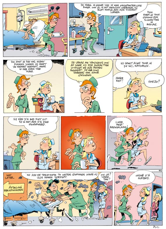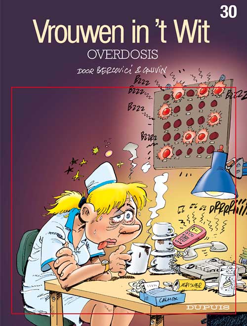 Een overdosis patiënten kun je alleen wegspoelen met een overdosis koffie! Een overdosis afgezette ledematen, een overdosis patiënten (met of zonder afgezette ledematen, een overdosis antibiotica, een overdosis stress, ... en voor de patiënten die al dan niet genezen en/of opgelapt naar huis vertrekken een overdosis rekeningen. Het risico is groot dat een aantal hoofdpersonages al die ellende probeert weg te spoelen met ... een overdosis koffie! De tandem Cauvin-Bercovici haalt in 'Vrouwen in 't wit' het volledige medisch corps door de scanner. Het resultaat is een hilarisch beeld van de ziekenhuiswereld met een wachtlijst die zich beperkt tot vierenveertig pagina's. Van facturen tot fracturen worden alle aspecten van de ziekenzorg met een brede glimlach op de hak genomen. De reeks, ontzettend populair bij artsen en medisch personeel, is een van de pijlers uit de Dupuis-catalogus. Ook in de boekhandel raken steeds weer nieuwe patiënten verslaafd aan deze wonderlijke lachtherapie.