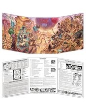 This judge's screen is printed on extra-thick, durable cardstock. One side features beautiful artwork and the other side has tables and reference charts for the DCC RPG Purple Planet campaign setting.