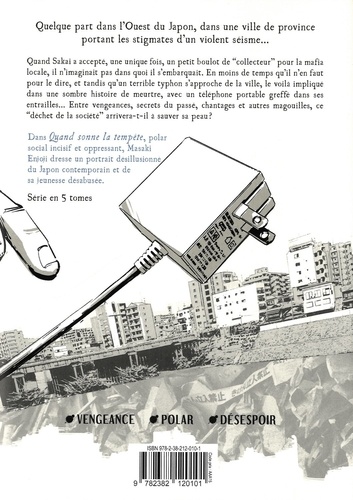 Une ville portant les stigmates d'une catastrophe naturelle, un téléphone portable greffé dans l'estomac, une sordide histoire de meurtre, un père qui cherche la revanche, un style graphique qui utilise à la perfection les ombrages... Voilà les ingrédients de "Quand sonne la tempête", un polar sombre et cruel, dans un Japon en perdition ! Quelque part dans l'Ouest du Japon, dans une ville de province portant les stigmates d'un violent séisme... Quand Sakai a accepté, une unique fois, un petit boulot de "collecteur' pour la mafia locale, il n'imaginait pas dans quoi il s'embarquait. En moins de temps qu'il n'en faut pour le dire, et tandis qu'un terrible typhon s'approche de la ville, le voilà impliqué dans une sombre histoire de meurtre, avec un téléphone portable greffé dans ses entrailles... Entre vengeances, secrets du passé, chantages et autres magouilles, ce "déchet de la société' arrivera-t-il à sauver sa peau