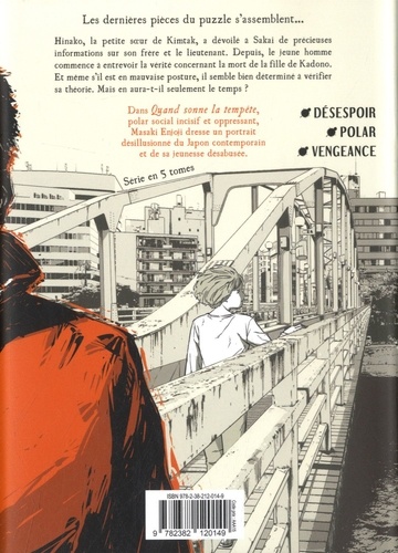 Dans Quand sonne la tempête, polar social incisif et oppressant, Masaki Enjoji dresse un portrait désillusionné du Japon contemporain et de sa jeunesse désabusée. Les dernières pièces du puzzle s'assemblent... Hinako, la petite soeur de Kimtak, a dévoilé à Sakai de précieuses informations sur son frère et le lieutenant. Depuis, le jeune homme commence à entrevoir la vérité concernant la mort de la fille de Kadono. Et même s'il est en mauvaise posture, il semble bien déterminé à vérifier sa théorie. Mais en aura-t-il seulement le temps ?