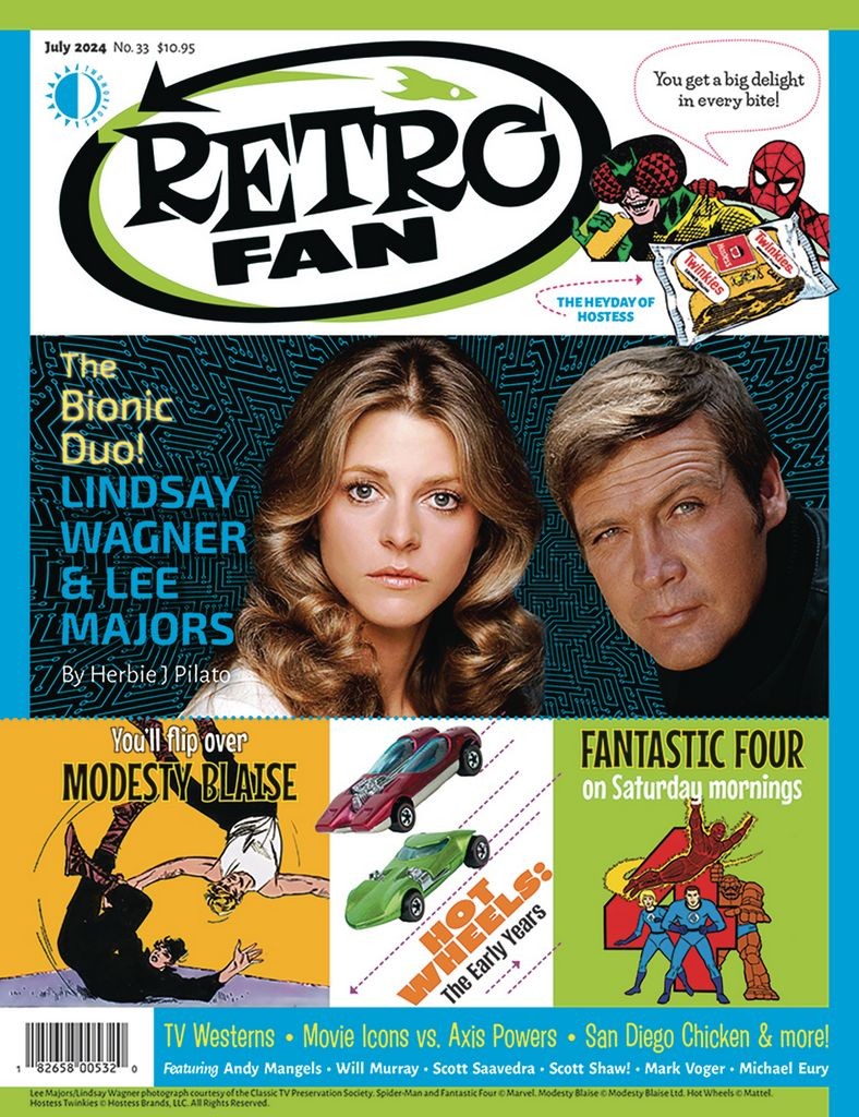 Meet the Bionic Duo, Lee Majors and Lindsay Wagner, courtesy of Herbie J Pilato! Plus: Hot Wheels: The Early Years, Fantastic Four cartoons, Modesty Blaise, Hostess snacks, TV Westerns, Movie Icons vs. the Axis Powers, the San Diego Chicken, and more! Featuring columns by Andy Mangels, Will Murray, Scott Saavedra, Scott Shaw, and Mark Voger.